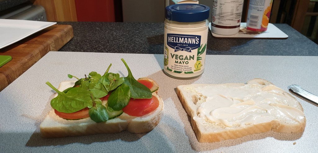 The result of some of my shopping. I love a good sandwich and salad is one of my favourite fillings. I don’t eat cheese anymore so I had to find an alternative and I do love a good vegan mayo. I have tried others but find this one is the best. Very nice it was too.