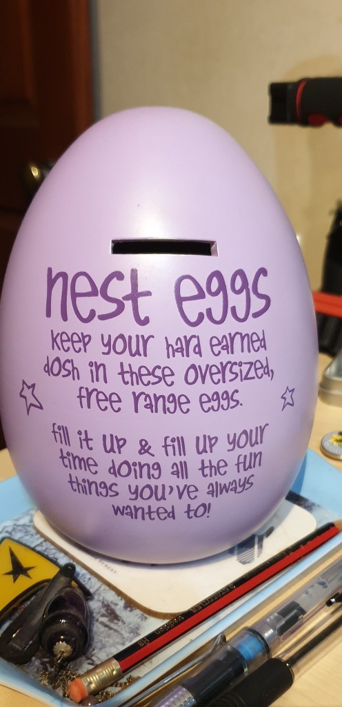 This is just a saving egg which I put all my 50 pence pieces and £2 coins in the help me save up for things. I have had it for many years now and when its full I put it in the bank. I’m not a good saver so I find it easier to save this way. When I have enough for the things I want to buy I can then pay for them with my card. If its in the bank its too easy to spend so in the egg it goes until its needed. Or until its full, whichever comes first.