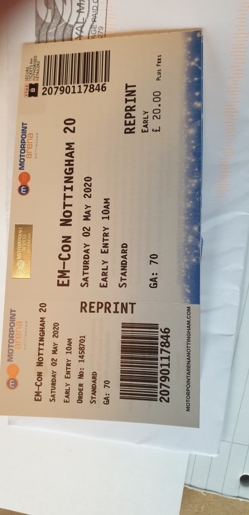 This is my ticket to EM-Con in Nottingham in May. I am looking forward to going to this again. This will be my second time at this event and there are some good people appearing this again this year. But it looks like I will be going on my own this year. When I went 2 years ago my cousins and sister went with me. Looks like they won’t be able to go this year. So, its me all on my todd this year.