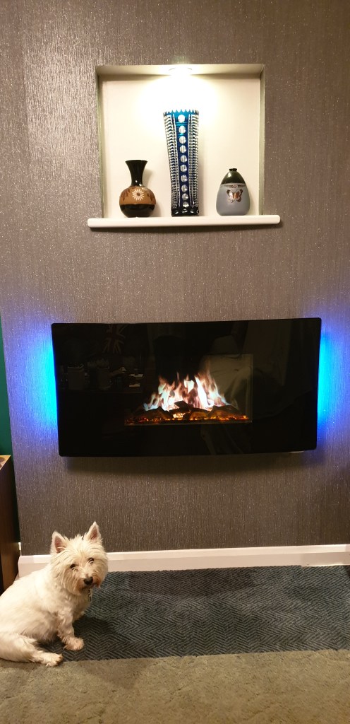 Another photo of our Millie. She loves to sit under the fire, which isn’t real but does blow warm air, which she loves to sit under. When our other Westie sits under the fire Millie will stare at her to get her to move. Excuse the carpet. There used to a brick fire so when we removed it left a gap where the carpet went up to it. We are in the process of changing it. This was taken just after we had just wallpapered the wall.