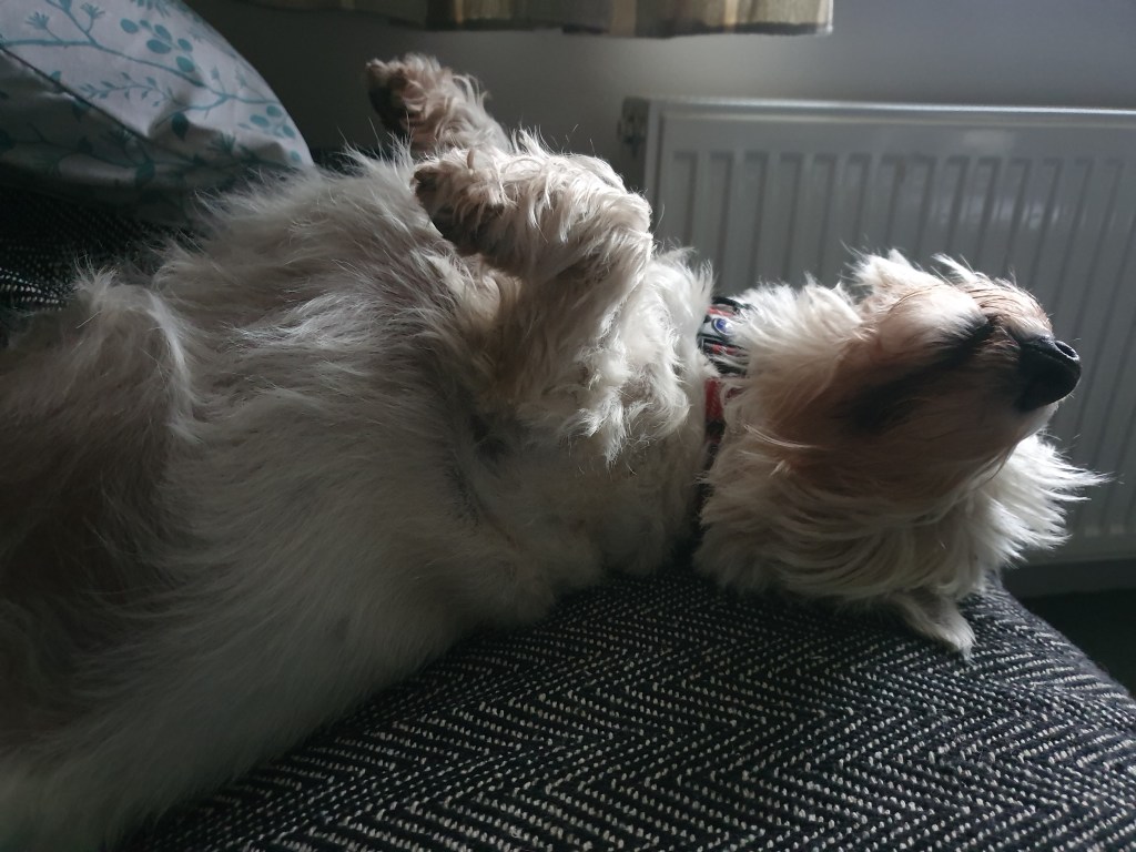 Then after dinner its time for a nap. Millie does like to sleep on her back at times. But you have to be careful not to wake her or startle her. She doesn’t like that at all. But when she is relaxed, really relaxed, then you know about it.