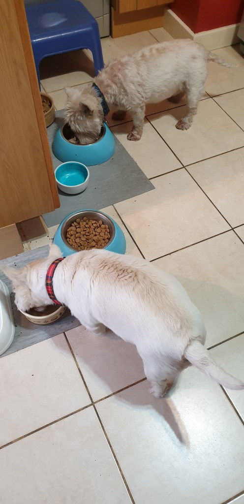 Today the girls had a treat. I give them a treat at least once a week. Sometimes twice. Depends on how good they are. Today they had some fresh chicken for their dinner. They get very excited when they know that they are going to get a treat. I can’t break it up fast enough for them. They really do enjoy a good meal. Makes a change from the usual.