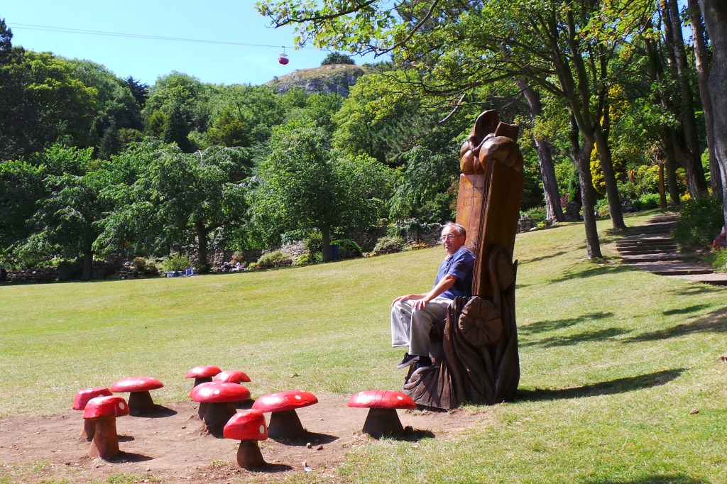 This seat was carved from a single piece of wood, which is the throne of the Queen of Hearts I believe, fronted by several toadstools. It is situated in Happy Valley close to the pier. In the background the cable car can be seen, which is the longest cable car in Europe, just over a mile long. It will take you close to the top of the Great Orme.