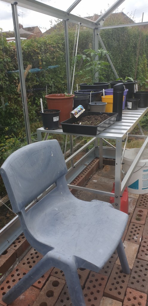 Who can resist a beer while sitting down in the greenhouse? A nice place to be admiring the plants and watching them grow. Its filling up nicely. And keeping the door closed makes it feel quite cosy.