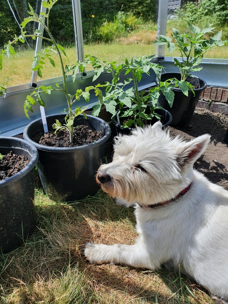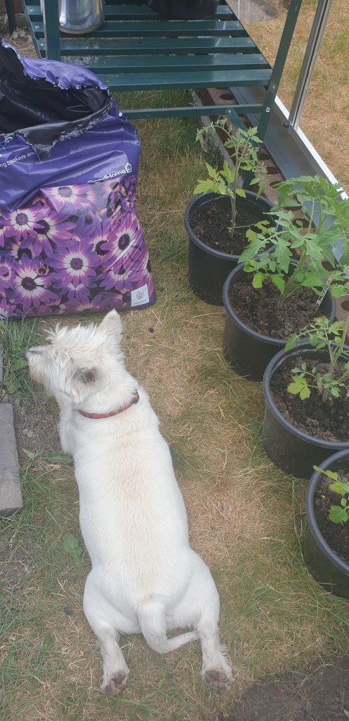Our other Westie enjoys sitting in the greenhouse also. Now the path is complete and gravel on either side, which we water so the humidity is higher and keeps the place damp during the night, its easier to keep the plants healthy. It can get quite warm in there at times. Could even use it as a sauna at times.